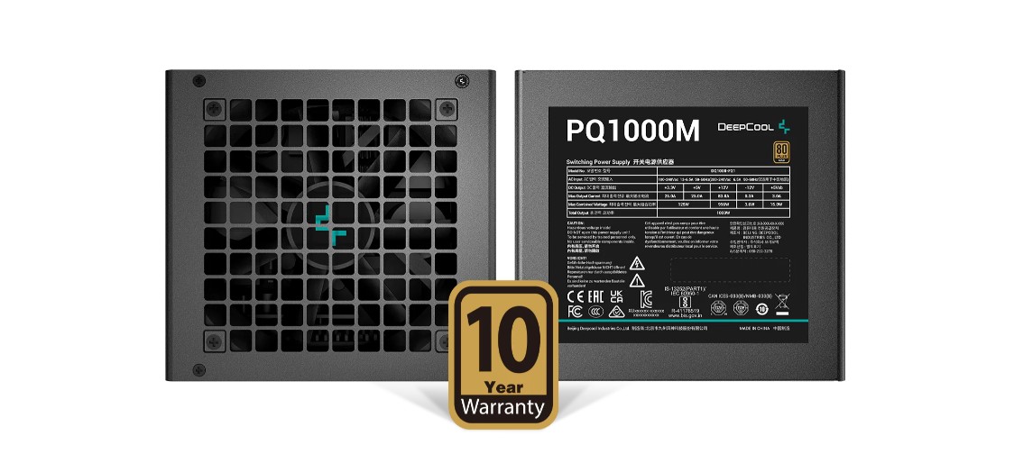 | Summary | DeepCool PQ1000M 80 PLUS Gold Modular Power SupplyThe DeepCool PQ1000M 80 PLUS Gold Modular Power Supply is a high-performance and reliable PSU (Power Supply Unit) designed to provide stable and efficient power to your PC components. With its 80 PLUS GOLD certification, it ensures excellent energy efficiency, operating at over 90% efficiency under typical load conditions (50% loading). This means not only will it power your system effectively, but it will also save you on energy costs and reduce heat generation, contributing to a cooler and more eco-friendly computing environment.One of the standout features of this power supply is its full modular design. The modular cables allow you to connect only the cables you need, reducing cable clutter inside your PC case. This not only enhances the overall aesthetics of your build but also improves airflow, which is crucial for maintaining optimal temperatures for your components. The included SATA connectors make it easy to connect your storage drives without unnecessary cable clutter.The DeepCool PQ1000M is equipped with a 120mm fluid dynamic bearing fan. This fan is not only efficient but also operates quietly, ensuring that your system remains cool and quiet even under heavy loads. The fluid dynamic bearing technology also contributes to the PSU's longevity, providing years of reliable performance.This power supply offers a main power connector with 24 (20+4) pins, ensuring compatibility with a wide range of motherboards. Whether you have a standard ATX or an E-ATX motherboard, this PSU has you covered. Its 1000W power rating is sufficient for high-end gaming rigs, workstations, and content creation machines, providing ample power for demanding components like high-end GPUs and multi-core CPUs.What sets the DeepCool PQ1000M apart is its impressive warranty. DeepCool backs this power supply with a 10-year warranty, which is a testament to its build quality and reliability. This long warranty period provides peace of mind and demonstrates the manufacturer's confidence in the product's durability.In summary, the DeepCool PQ1000M 80 PLUS Gold Modular Power Supply is an excellent choice for those seeking a high-performance, energy-efficient, and reliable PSU for their PC builds. Its modular design, quiet operation, and 10-year warranty make it a compelling option for gamers, enthusiasts, and professionals who demand the best from their power supply unit. With the PQ1000M, you can power your high-performance system with confidence while maintaining a clean and efficient cable management setup.Features:A NEW GENERATIONIn our dedication to the mission of self-improvement and higher quality standards, the PQ-M Series PSU is a commitment from DeepCool to provide a trustworthy and reliable power supply. With a strong and dependable foundation, DeepCool is helping build better systems today that meet the expectations of tomorrow.BUILT SOLIDCarefully constructed throughout with quality components to ensure pristine power output quality. The modular board is hard connected to the circuit platform instead of traditional cables for added rigidity and less signal noise.SILENCE IS GOLDENAfine-tuned silent fan curve helps produce a perfect balance between cooling and silence, with an additional fan stop option during low temperature conditions. A rear fan control button also allows the option for setting a minimum fan speed when fanless mode is not preferred.Optimized thermal performanceReduced noise levels overallLonger lasting lifespanBEST OF THE BESTFluid Dynamic Bearing (FDB) fans are considered the best-in-class for operating noise and life expectancy compared to other fan bearing types. The hydrodynamic and fluid-based properties greatly reduce friction and vibration that enables better reliability and quiet operation.some additional features of DeepCool PQ1000M 80 PLUS Gold Modular Power Supply include:Over Voltage Protection (OVP): The power supply includes OVP circuitry, which safeguards your components by preventing excessively high voltages from reaching them.Over Power Protection (OPP): OPP technology ensures that the power supply can handle power loads within safe limits, protecting both your components and the PSU itself.Short Circuit Protection (SCP): SCP safeguards against short circuits, minimizing the risk of damage to your PC components in case of electrical faults.Under Voltage Protection (UVP): UVP helps prevent damage to your components by monitoring and maintaining proper voltage levels, even under low-load conditions.High-Quality Components: The PSU is built with high-quality components, including Japanese capacitors, which contribute to its overall reliability and longevity.Active PFC (Power Factor Correction): Active PFC technology enhances power efficiency and reduces energy wastage, resulting in a cleaner and more stable power supply to your components.Wide Compatibility: With its full modular design and 1000W power output, the PQ1000M is compatible with a wide range of motherboards and high-performance PC configurations.Efficient Cooling: The 120mm fluid dynamic bearing fan not only operates quietly but also helps maintain optimal operating temperatures, extending the lifespan of the power supply.Energy Efficiency: The 80 PLUS GOLD certification indicates that the power supply meets stringent efficiency standards, reducing energy consumption and heat generation.Stable Voltage Output: The PQ1000M delivers stable and reliable voltage output, ensuring that your components receive consistent power, even during demanding tasks and gaming sessions.Safety Approvals: The power supply complies with safety standards and has undergone rigorous testing to meet industry certifications, ensuring safe and reliable operation.Multiple SATA Connectors: With four SATA connectors, the PSU provides ample support for connecting multiple storage drives, including SSDs and HDDs.DeepCool PQ1000M 80 PLUS Gold Modular Power Supply Review:The Deep