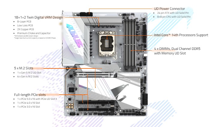 - PCIe UD Slot X: PCIe 5.0 x16 slot with 10X strength for graphics card